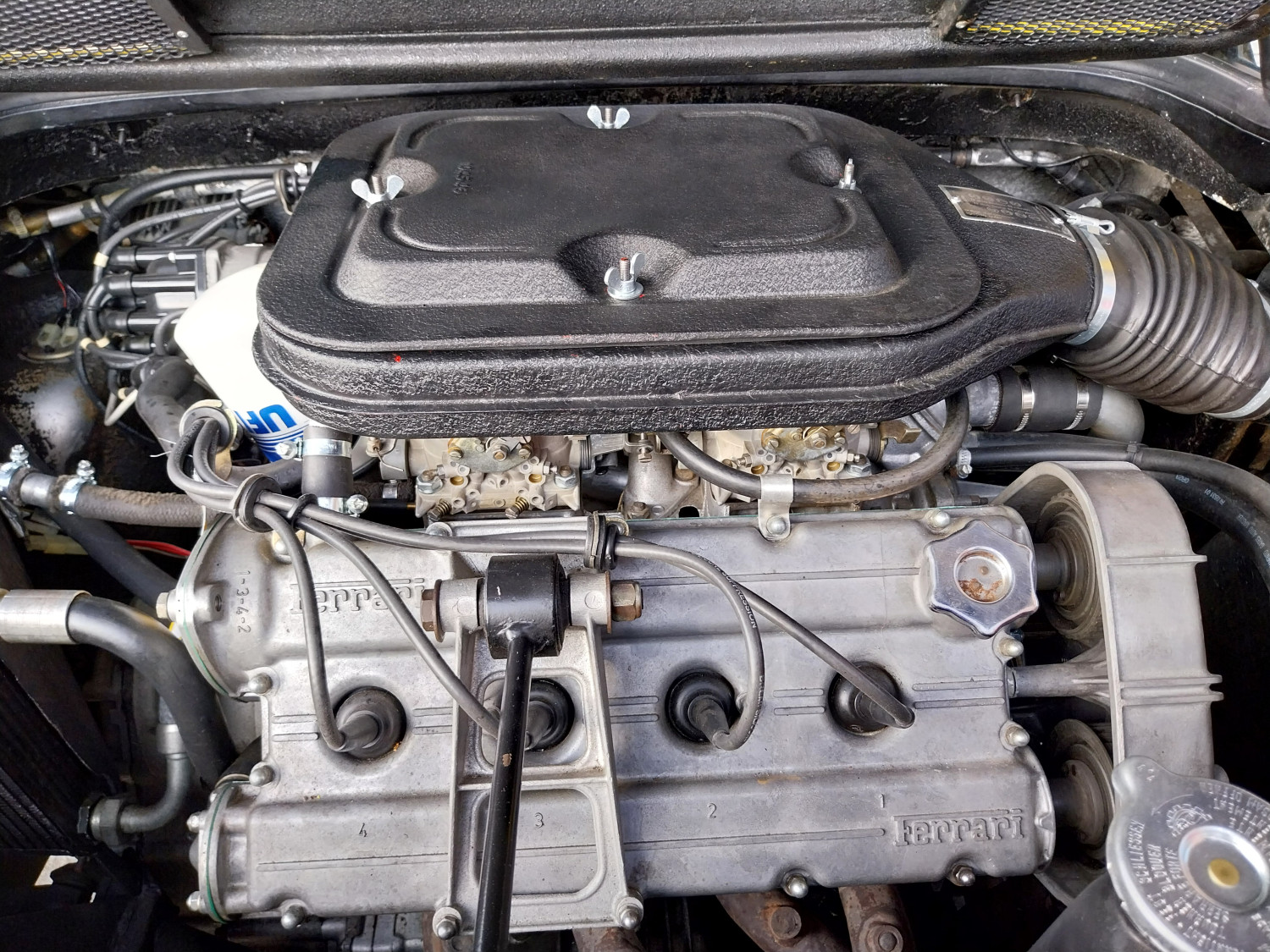 Dieser, hier angebotene 308 GTB, in seltenem, wie ikonischem ‚Modena Giallo‘, wurde zunächst nach Östereich ausgeliefert bevor er seinen Weg in die Hände von Mitgliedern des niederländischen Ferrari Clubs in Holland fand. 2016 kam er nach Deutschland, wurde regelmäßig gefahren und im Frühjahr 2025 einer Generalüberholung mit Zahnriemenwechsel unterzogen. Bei dieser wurde auch der defekte Originalmotor durch einen instandgesetzten GTS Motor (ohne Trockensumpfschmierung) ausgetauscht. Nun präsentiert er sich mit 4 Doppel-Weber-Vergasern und einem super Sound durch ein Edelstahl-Sport-Auspuff-System.