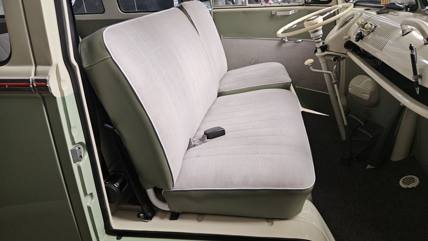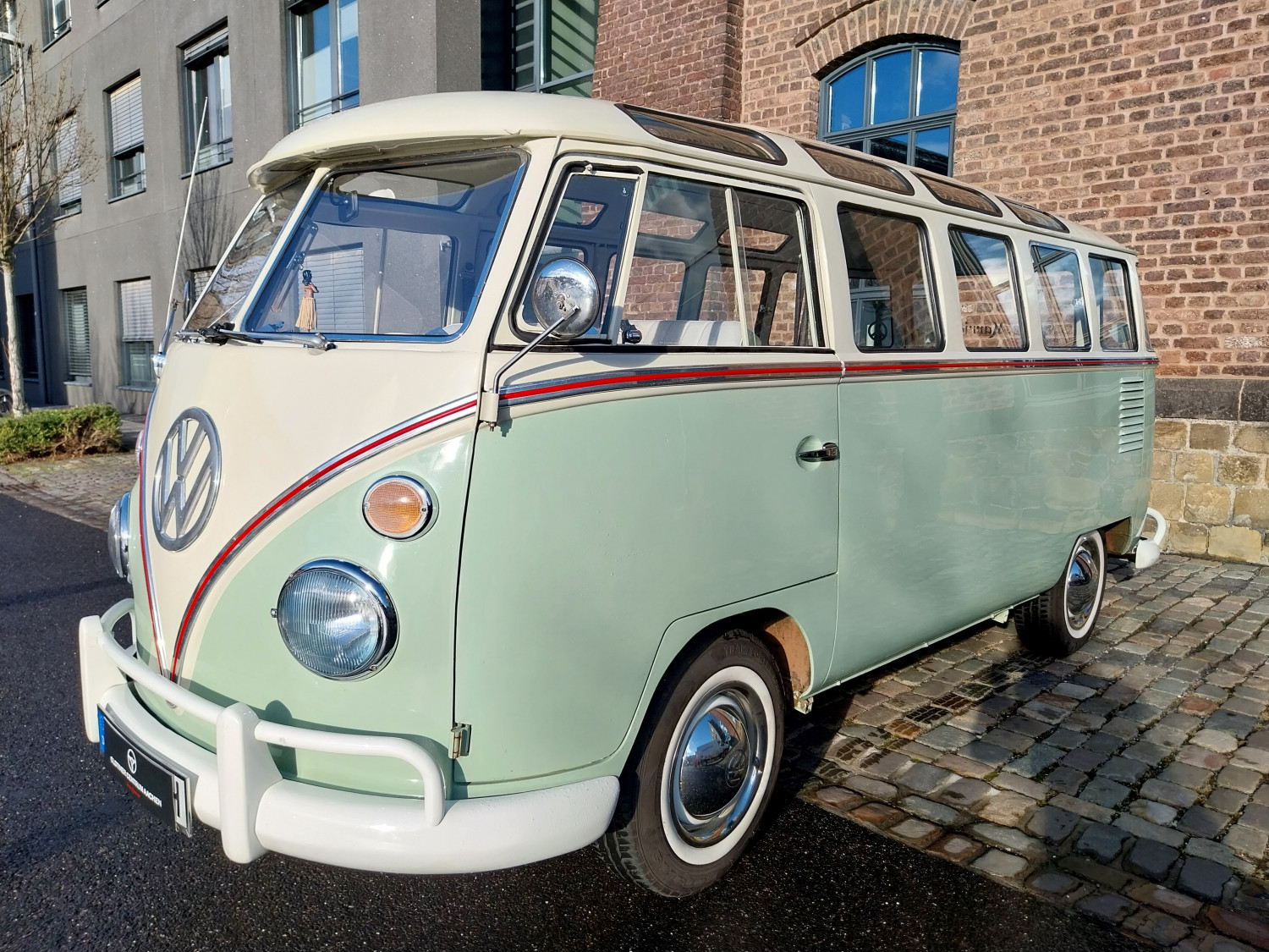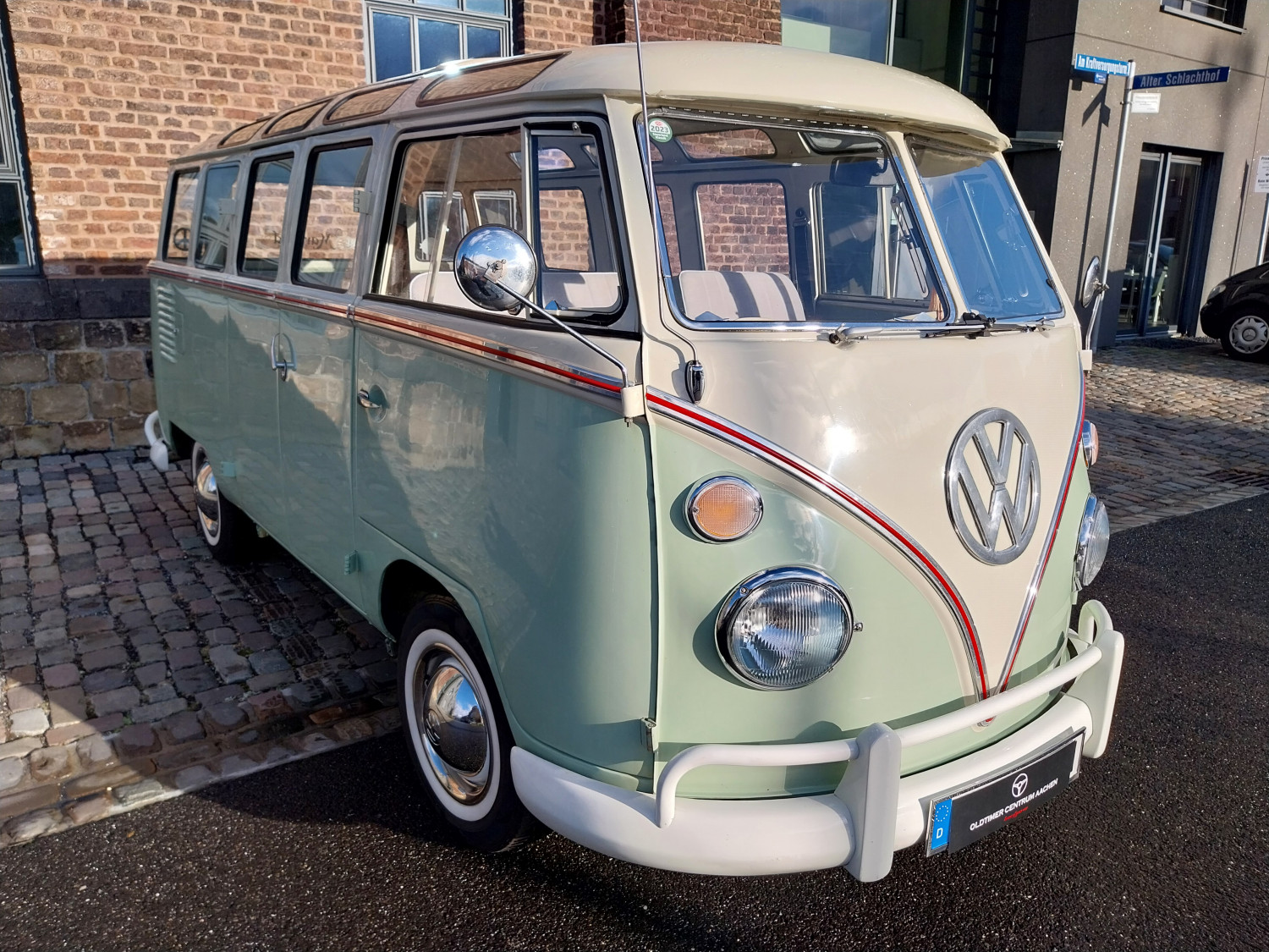 Dieses begehrte Sammlerobjekt glänzt mit seinen 23 Fenstern, die eine Rundumsicht ermöglichen sowie seiner harmonischen zweifarbigen Lackierung und der Safari-Frontscheibe, die sich komplett öffnen lässt. Der Innenraum ist mit drei Sitzreihen und 9 Sitzplätzen sehr geräumig ausgestattet.